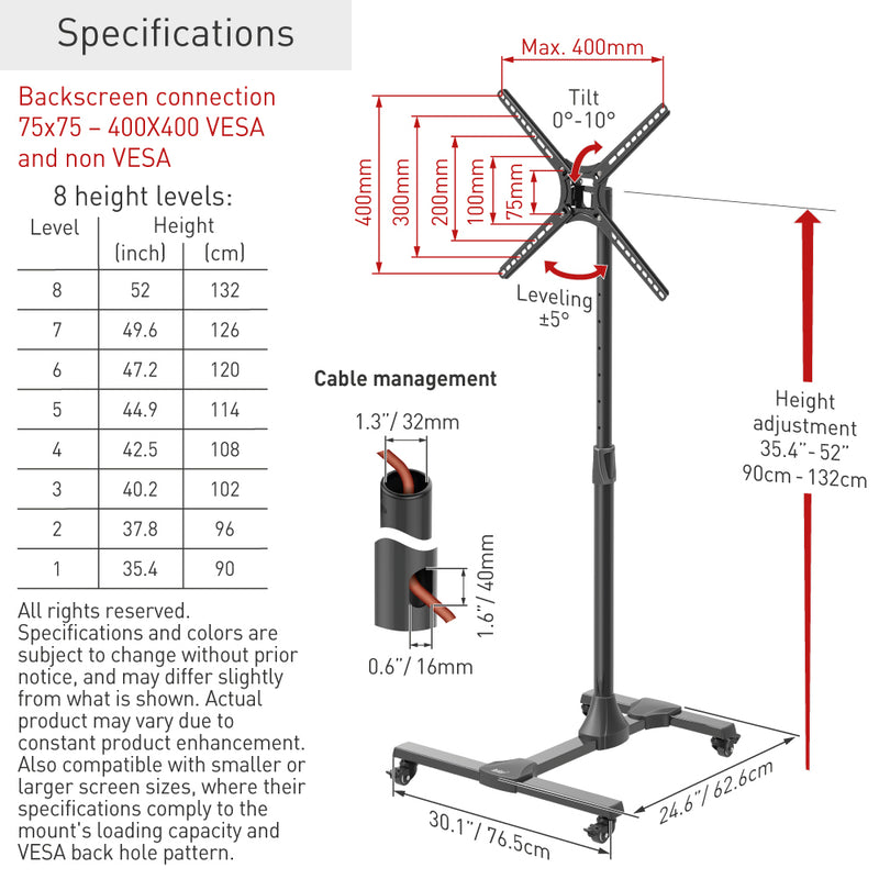 8 optional height levels from 35.4"/ 90cm to 52" /132cm.