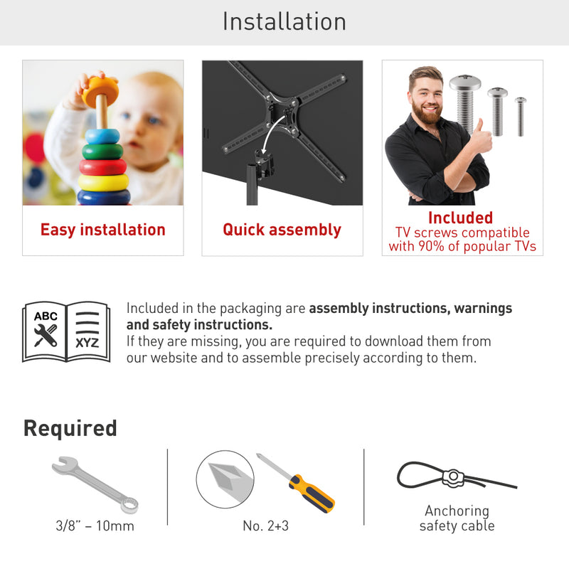 Please check the list of included screen-connection screws in the assembly instructions. If your screen requires different screen-connection screws, please purchase them in your local hardware store.