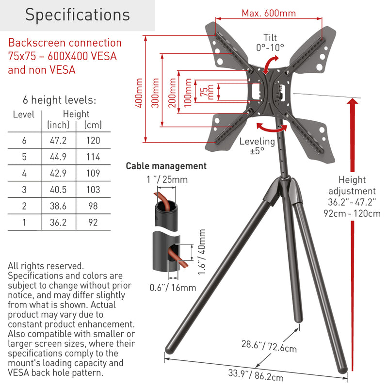 The stand has a tool-free tilt from 0° to 10° and a +/-5° leveling after the installation.
