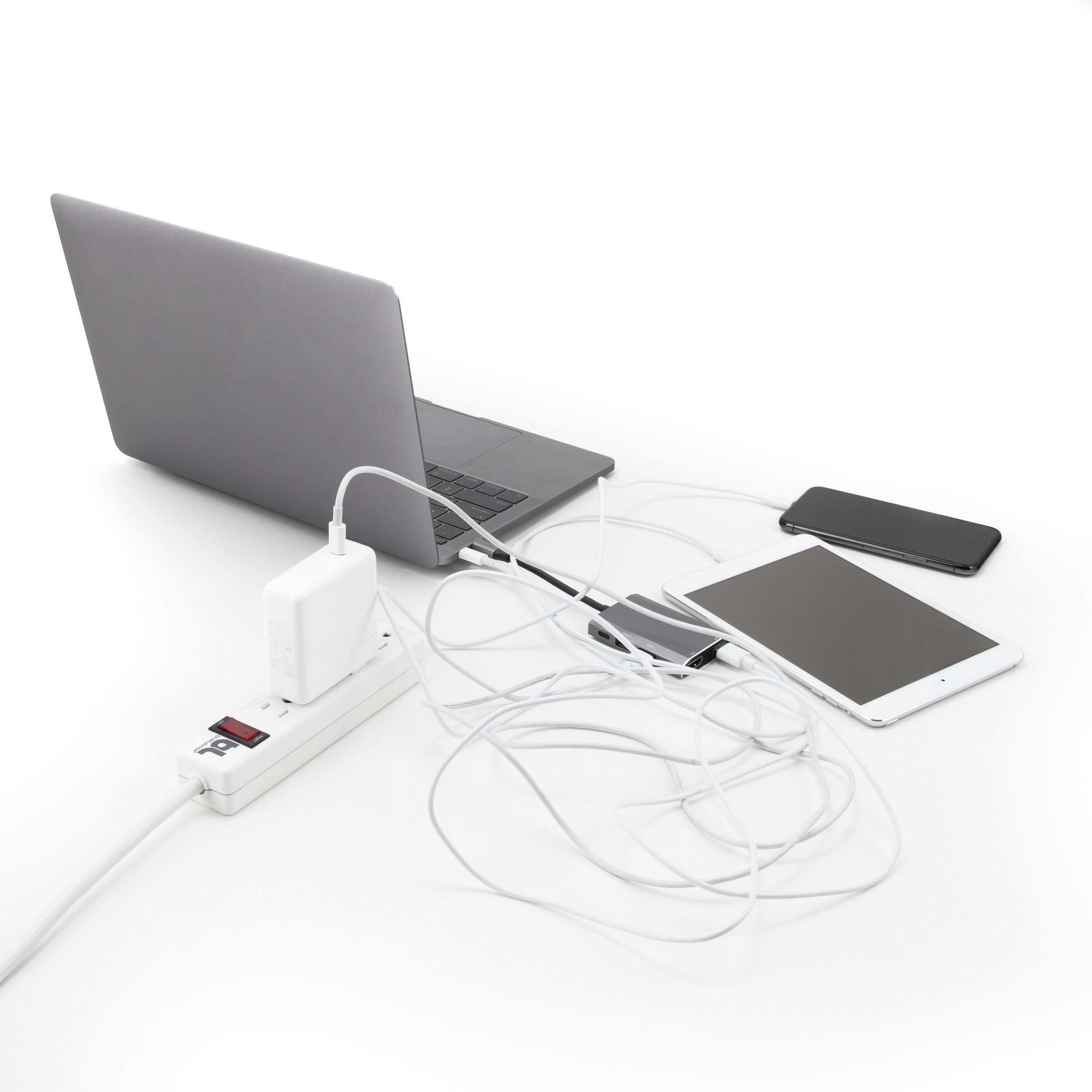 Designed for your desktop to hide power strips, chargers, and more. Integrated device stands on the top hold your smartphones, tablets, and notebooks. Pass-through slots for charging cables power your devices sitting on top. An included 4 socket surge protector gives you four places to plug in your most important devices.