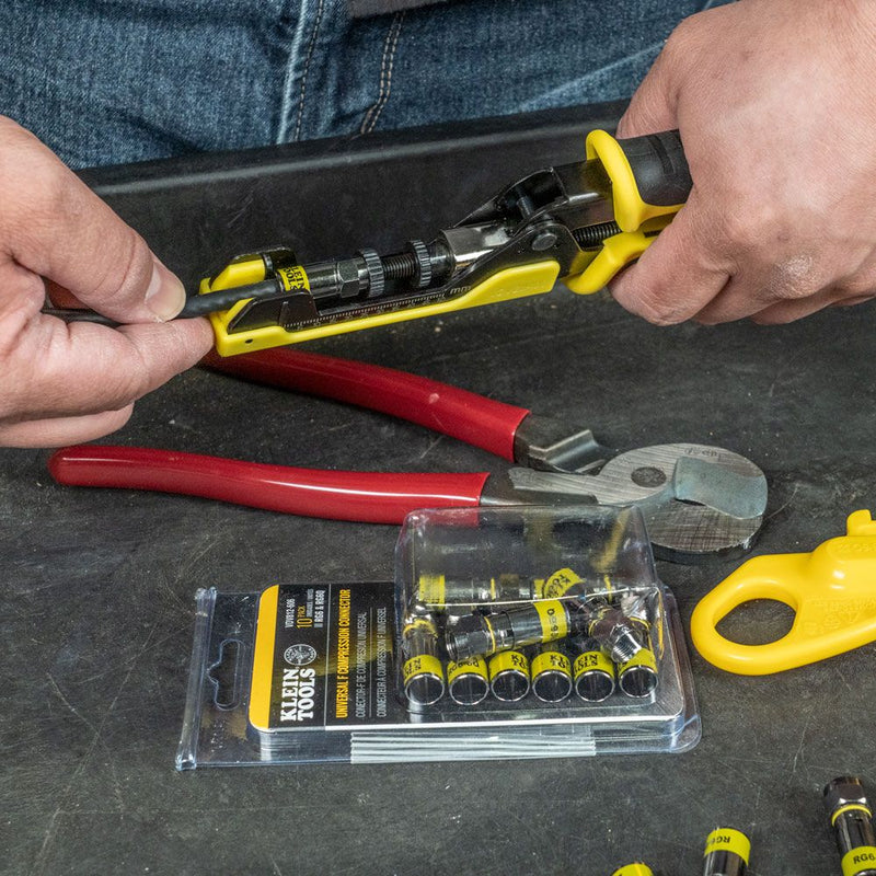 Universal F Compression Connectors from Klein Tools utilize new technology to install up to five times faster than standard compression connectors. These innovative connectors have patented viewing windows built right in to aid in proper seating and are designed to fit all diameter variations. They are compatible with multi-shielded and plenum cables that are typically difficult to work with. Constructed of premium quality, solid brass for durability, these connectors have an elegant dark nickel-plated finish.