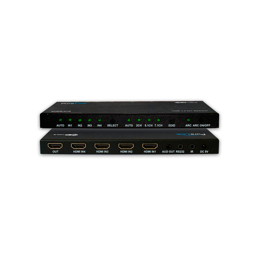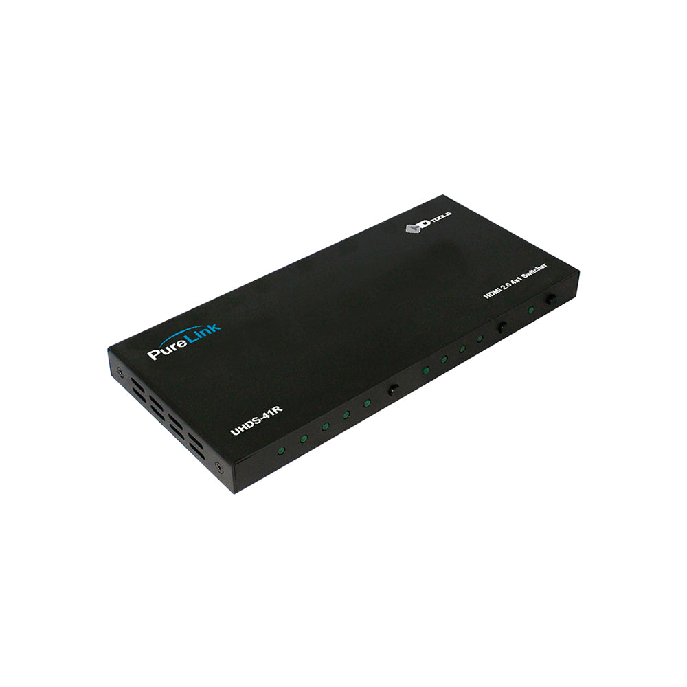 The HDTools™ UHDS-41R provides switching of up to four (4) Ultra HD/4K sources to a single Ultra HD/4K display. The UHDS-41R combines the latest technologies, including HDMI 2.0 and HDCP 2.2 support, with user-friendly configuration and operation via RS-232, IR, or front panel control to deliver a simple and effective multi-input A/V switching solution.
