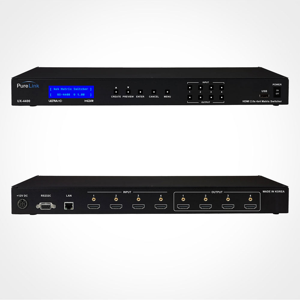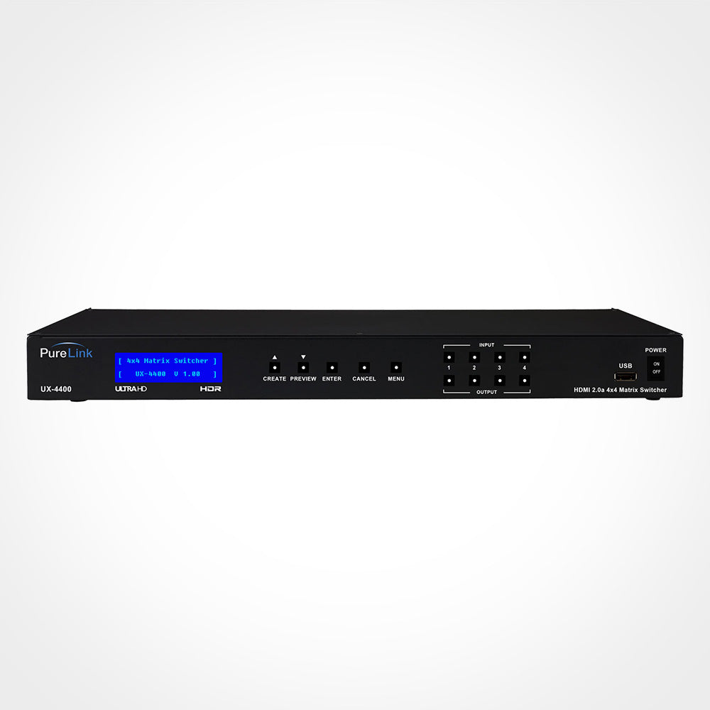 The UX line of HDMI matrix switchers from PureLink AV allows you to incorporate all the latest HD technology into your setep. The UX-4400 supports High Dynamic Range (HDR) video, resolutions up to 4Kx2K @ 50/60 Hz, and is HDCP 2.2 compliant. This innovative switcher allows you to toggle between four different sources on four separate displays or TVs. It's ideal for installations in retail establishments, conference rooms, classrooms, and hospitality environments.