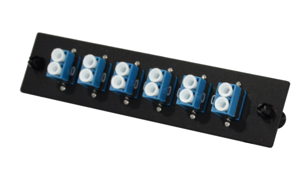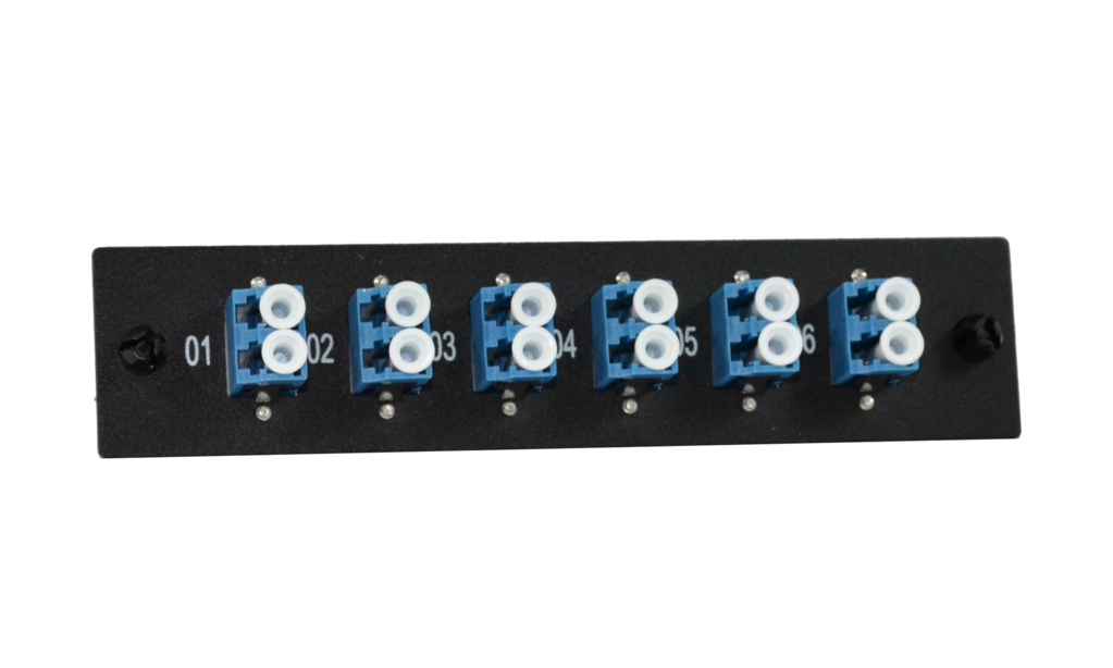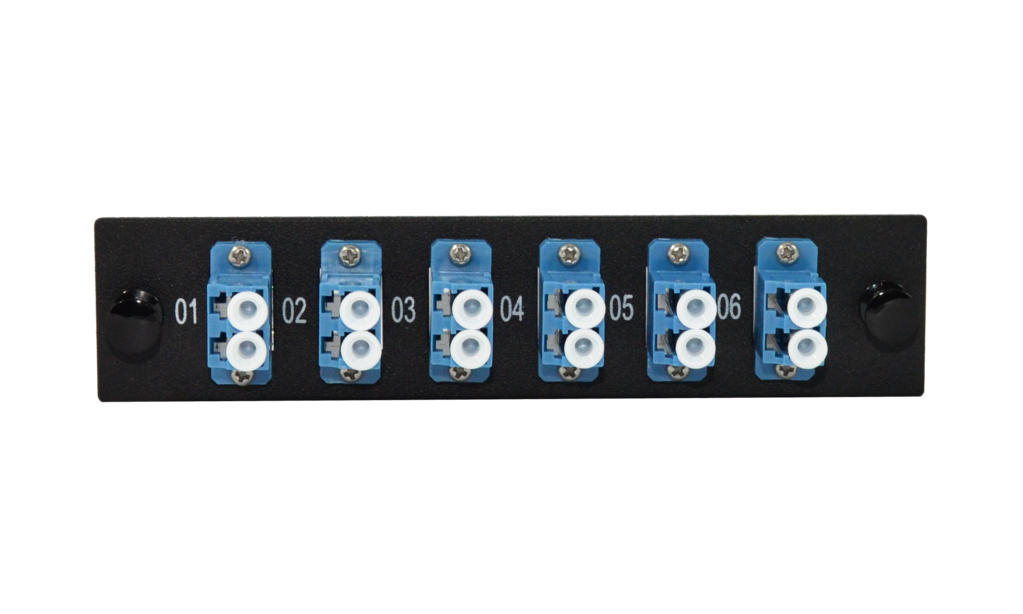- Six duplex pass-through connectors (supports twelve total strands of fiber)