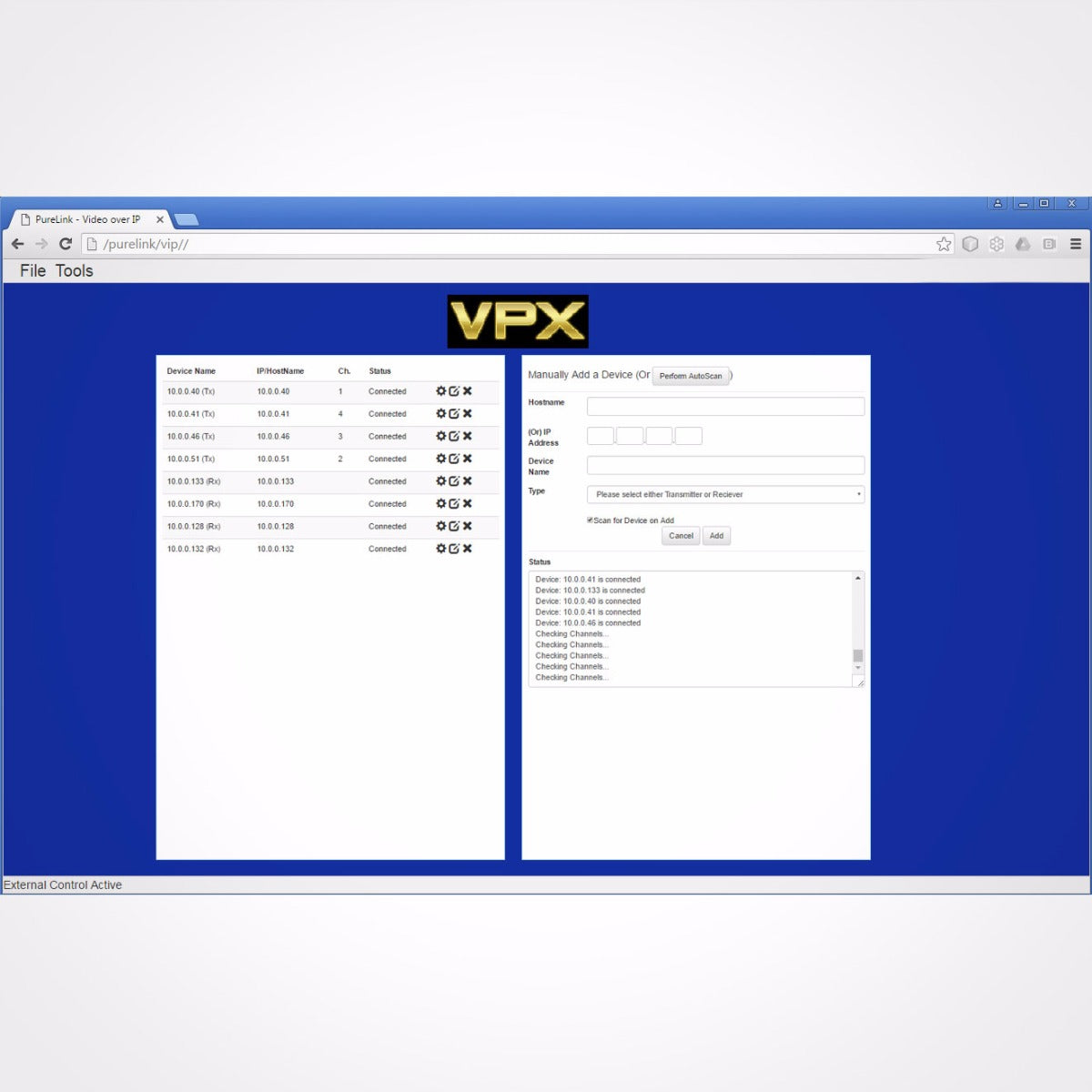 Designed to simplify and automate installation and monitoring of the VIP Series of transmitters and receivers from PureLink AV, this VPX IP Management Software enables automatic device recognition, advanced diagnostics, presets and excution schedules, and can automatically build the I/O device map or allow manual creation and editing. With a browser interface, you can enjoy convenience and easy access to the network via mobile devices like tablets.