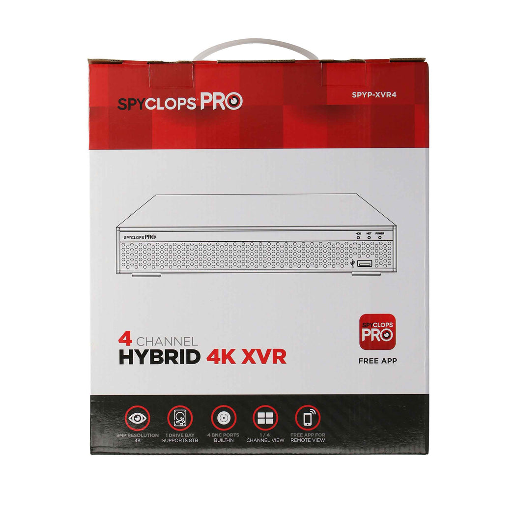 Record video surveillance in up to 8MP 4K for each channel with the Spyclops PRO 4-channel XVR. This 4K capable Video Recorder supports H.265 and H.265+ for maximum video storage efficiency. HDD drive bay supports up to 8TB HDD. The NVR has VGA and HDMI outputs and uses 4-channel BNC connections.
