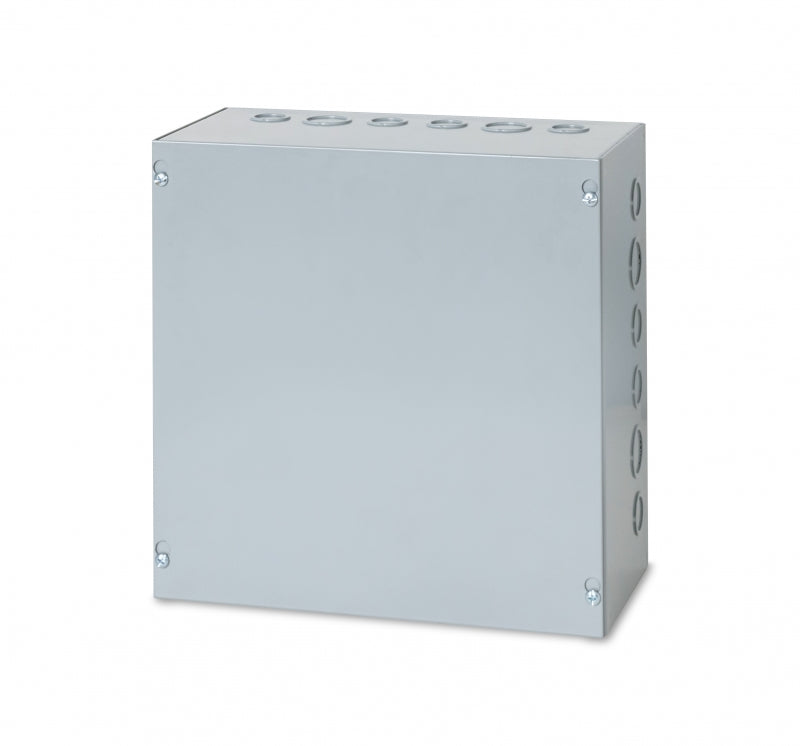 Fabricated in accordance with UL specifications from code gauge steel. Boxes are furnished with or without knockouts. If knockouts are requested, a combination of 1/2 - 3/4" and 3/4 - 1" standard conduit sizes are furnished. Boxes under 48"x36" have 5/16" mounting holes. Boxes 48"x36" and over have 7/16" mounting holes. Keyhole slots in covers are standard in square boxes up to 24" x 24".