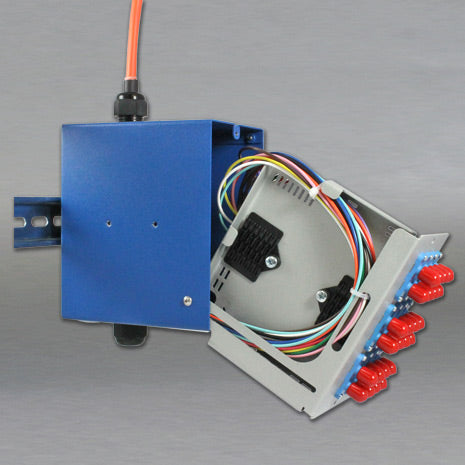 Compact DIN-Rail or surface mount fiber optic patch panel. Compact size allows minimum space requirements within control cabinetry. Device includes a splice tray to allow fusion splicing of field cabling (pigtails sold separately). Device features a sliding faceplate with capture mechanism to allow patch panel to be kept open “hands-free”.