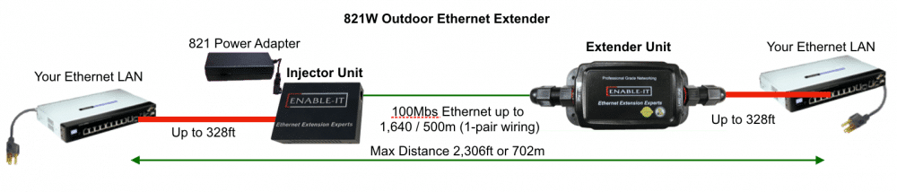 These American-made Enable-IT 821WC Outdoor Coax Ethernet Extender use industry LAN standard RJ-45 (8-pin) connectors to make installing in most any environment very easy. We have engineered most of the technical complexity into automatic line adjustments so the plug and go simplicity on your existing or new wiring is a snap. Ethernet Extension Experts designs and manufactures the 821W Ethernet) Extender kit, along with its entire product line, in the USA that makes us more responsive to customer demanding needs. We use the highest quality materials and craftsmanship.