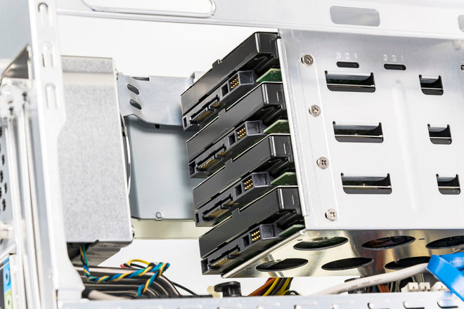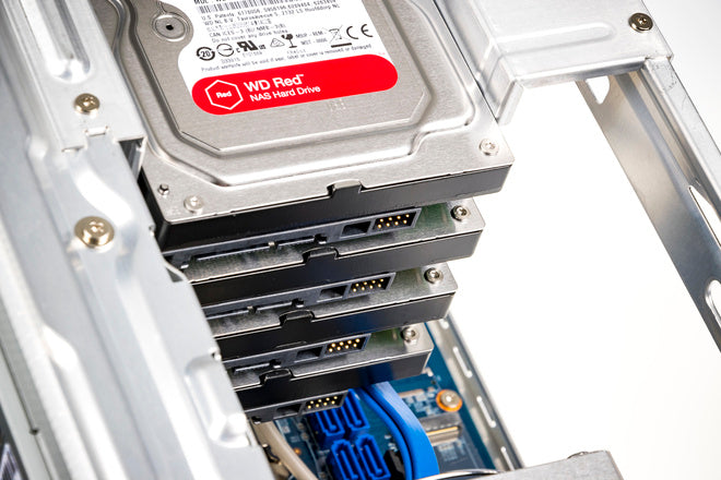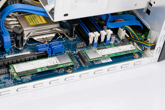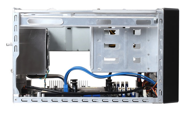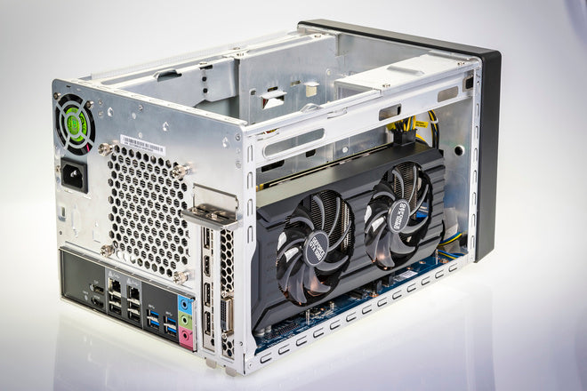 This Mini-PC offers sufficient space in the chassis for four 3.5" HDDs (or 2.5" drives with installation frame) and thus several dozen terabytes of memory. An active ventilation system prevents any build-up of heat.