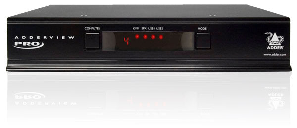 The ADDER View Pro can be switched using selectable keyboard hotkeys, 3 button mice or the front panel controls. Optionally, you can also use the RC4 remote switch to make your selection .These switching options allow you to rapidly reassign connected devices to any of the connected computers.