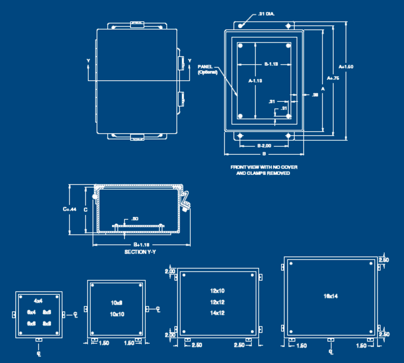 Fabricated in accordance with UL specifications from 14 gauge steel. Neoprene gasket attached to cover with oil resistant adhesive. Stainless steel external screw clamps on three sides. Continuous hinge. Continuously welded seams ground smooth. External mounting feet. Enclosures that are 6x4x3 and over are provided with stand-offs for mounting optional panel.