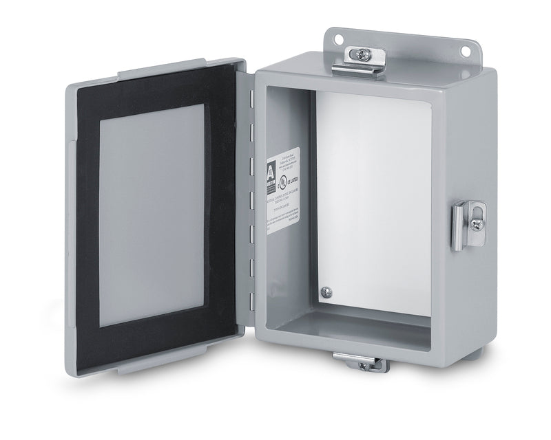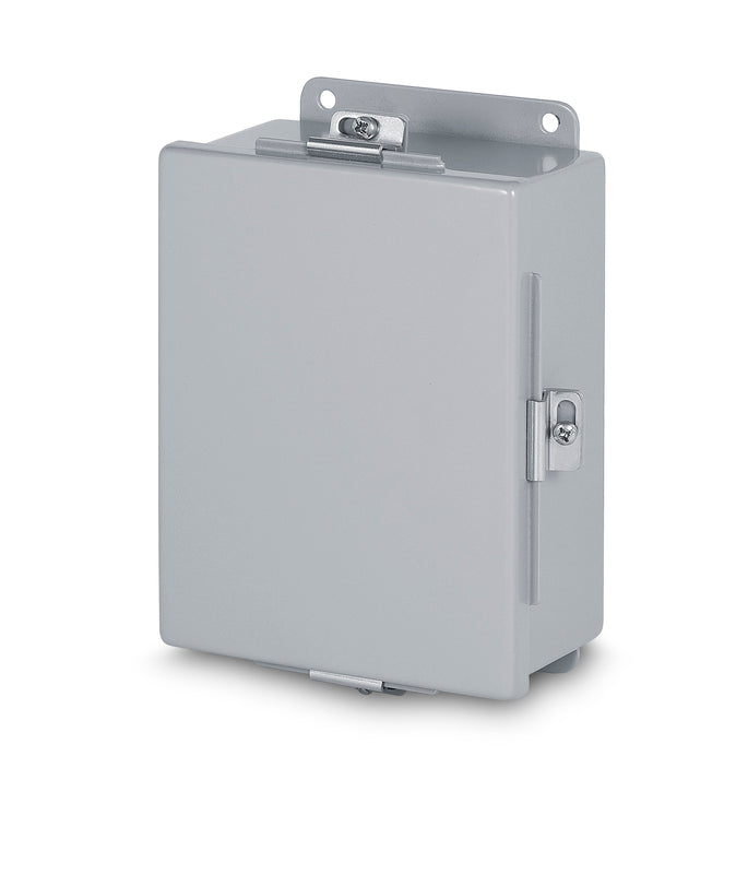 Fabricated in accordance with UL specifications from 14 gauge steel. Neoprene gasket attached to cover with oil resistant adhesive. Stainless steel external screw clamps on three sides. Continuous hinge. Continuously welded seams ground smooth. External mounting feet. Enclosures that are 6x4x3 and over are provided with stand-offs for mounting optional panel.