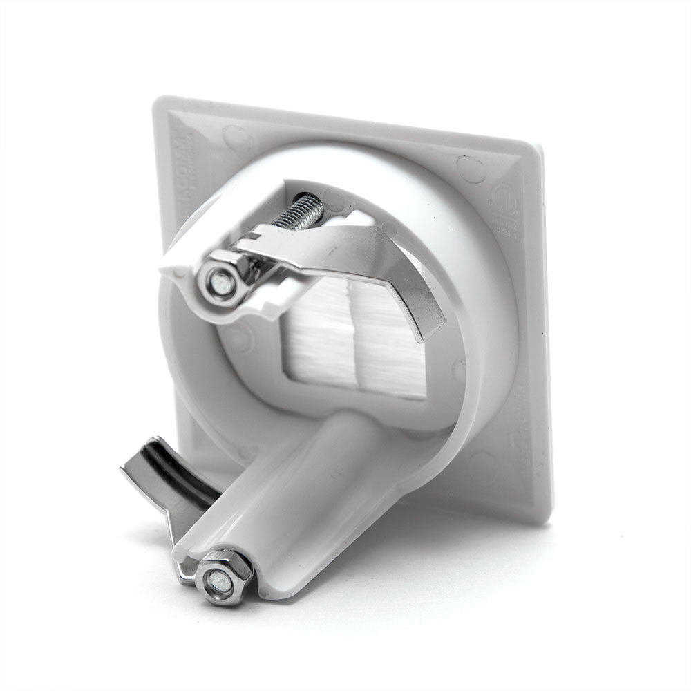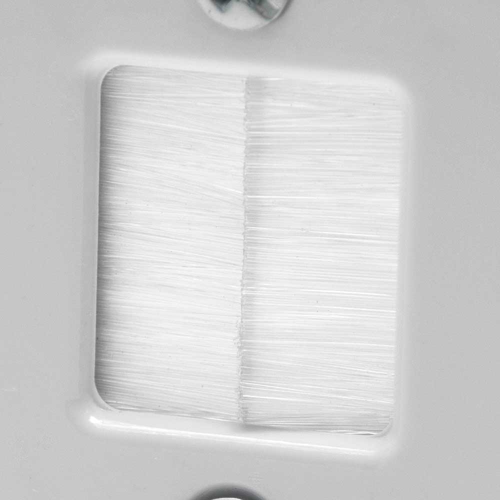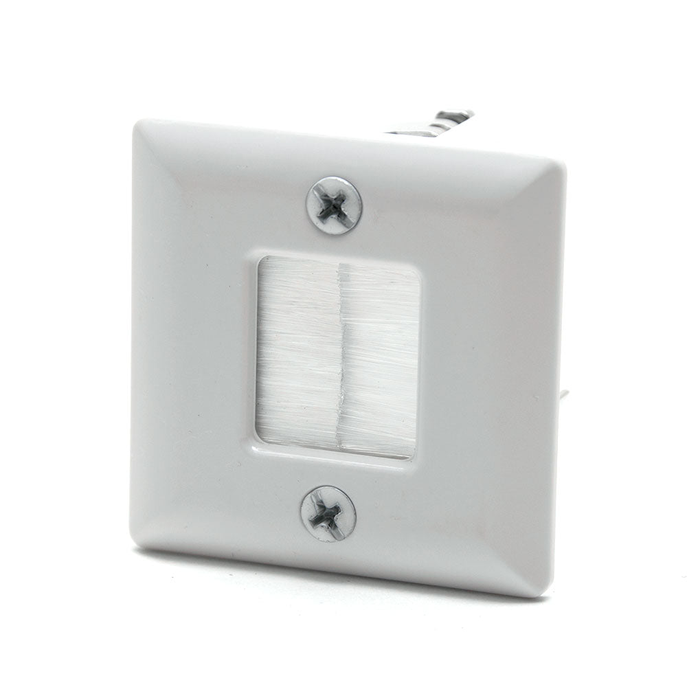 This two-by-two-inch wall plate is designed to conceal low voltage cables behind the smaller home theater and security equipment. The compact design mounts inside a 1-3/4 inch hole and features a 0.77 x 0.87-inch brush opening. Built-in wings enable mounting without the need for a low voltage mounting bracket. Simply tighten the screws into place for a secure hold.