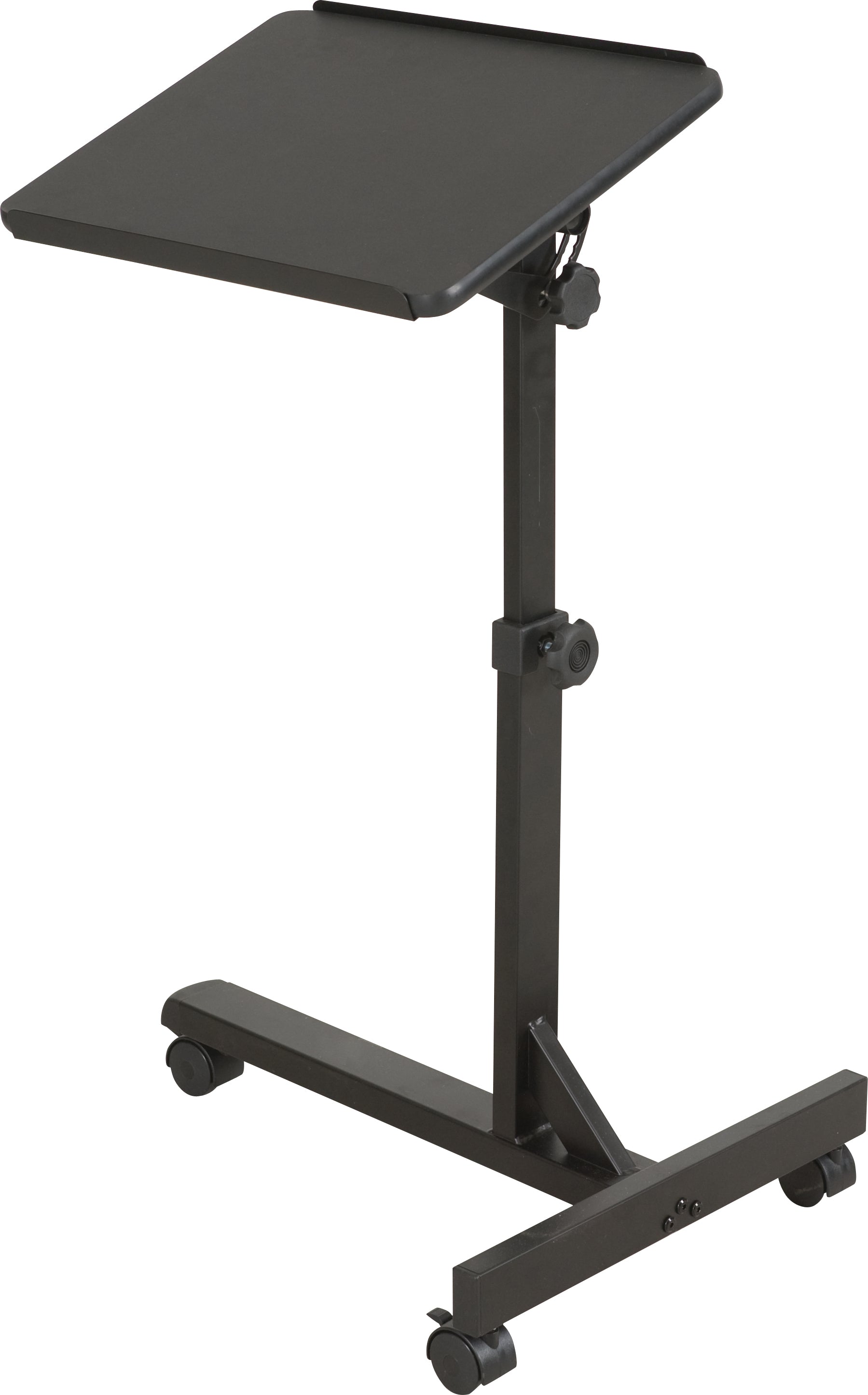 Keep your laptop handy and within reach with the compact Lap Jr. laptop stand. Featuring a low profile leg that can roll under a desk, under a chair, or under a sofa, the stand can be used virtually anywhere. Top measures 18"W x 14"D and adjusts from 27" to 42"H. Adjusts in angle from 45° to -45°. Black powder-coated steel frame with black laminate platform.