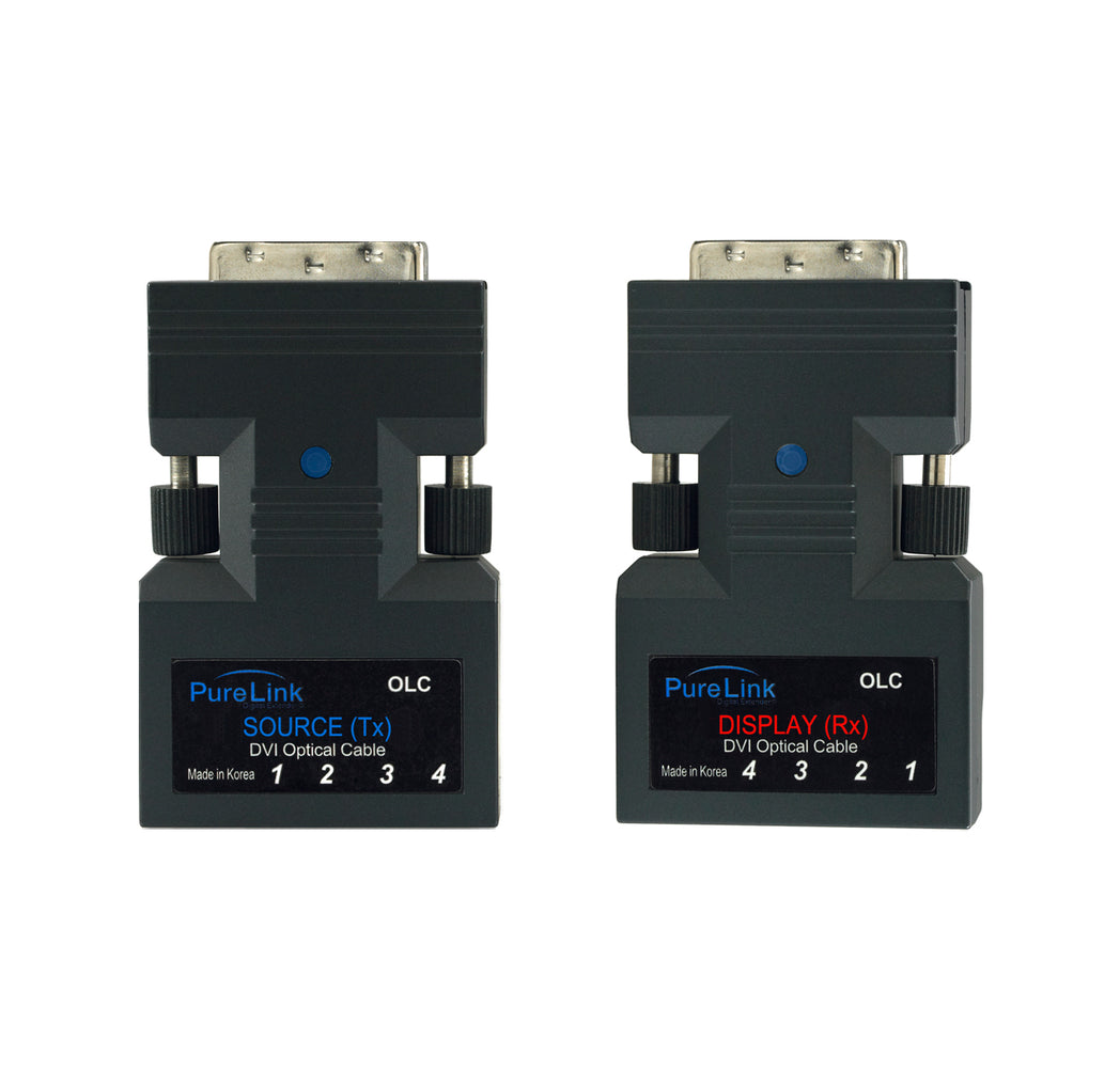 The PureLink OLC Tx/Rx DVI to 4LC Fiber Extender Unit extends a high definition 1080p signal up to 1640 feet over four strand fiber optic cable. Convenient automatic EDID management eliminates the need for a separate DDC connection.