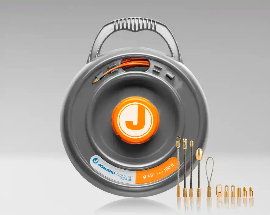 The Jonard Tools FTF-1125 has been designed to be the ultimate non-conductive fish tape dispenser and winder. With its built-in handle, fastening and anchoring system, center compartment, and two furling systems, this fish tape system is perfect for pulling wire or cables through conduit, walls, or under carpets.