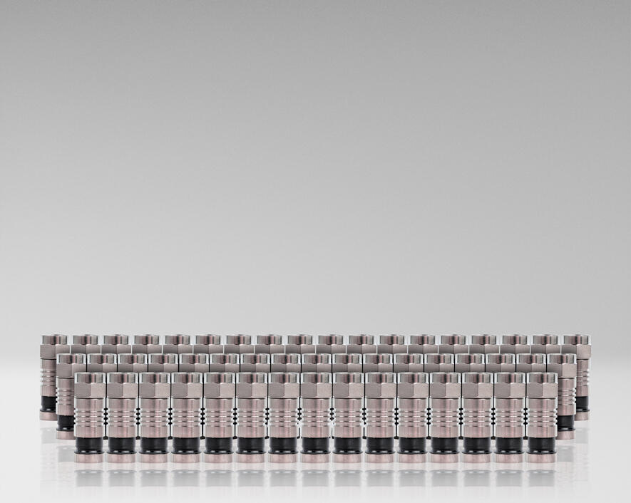 These RG6 connectors are universal compression connectors, ideally suited for professional and consumer use. The one-piece design of these connectors makes them simple to use and provides a secure 360° compression seal, resulting in maximum RF shielding performance. The all-metal design of the connector body and nut allows for unparalleled electrical and mechanical performance. The detachably coupled advanced polymer compression system is pre-positioned to ensure a consistent fit with the cable.