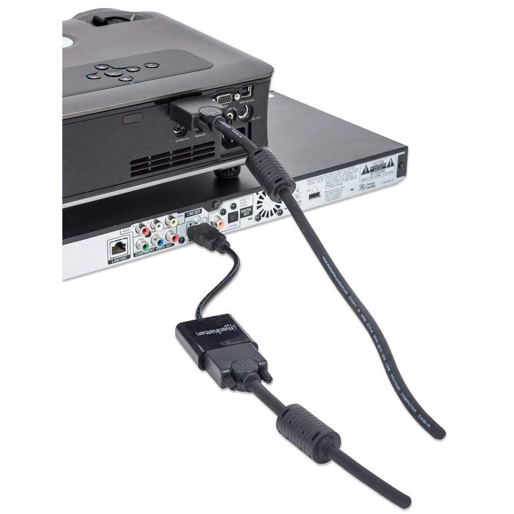 The Manhattan HDMI to VGA Converter helps establish a fast, simple and convenient link between newer HDMI-equipped desktop and notebook computers and other media sources with existing VGA monitors, projectors and other display devices. The Manhattan HDMI to VGA Converter is easy and quick to install and requires no complicated configuration or setup to help extend the service life and fully realize the investment and value of legacy VGA displays, projectors and other equipment. This low-power, cost-effective and reliable solution allows users to transition to HDMI bandwidths, resolutions, Deep Color and more without the expense of upgrading to newer and costly monitors and projectors. Its integrated, all-in-one design helps achieve a compact, integrated solution that eliminates unnecessary cables, tangles and clutter to keep installations and work spaces neat and orderly. Its Micro-USB port allows for additional power if required.