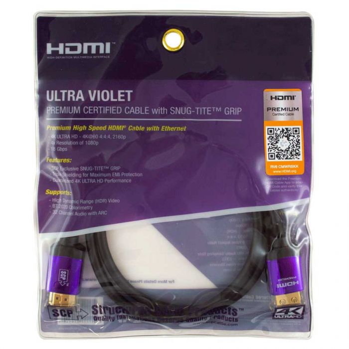 This new SCP Ultra Violet Series cable has been ATC tested and certified to Premium High Speed HDMI® Cable with Ethernet performance standards. SCP Premium Certified cables are specially shielded to provide maximum EMI protection. SCP Premium Certified cables are the professionals choice for 4K/Ultra HD performance and reliability.