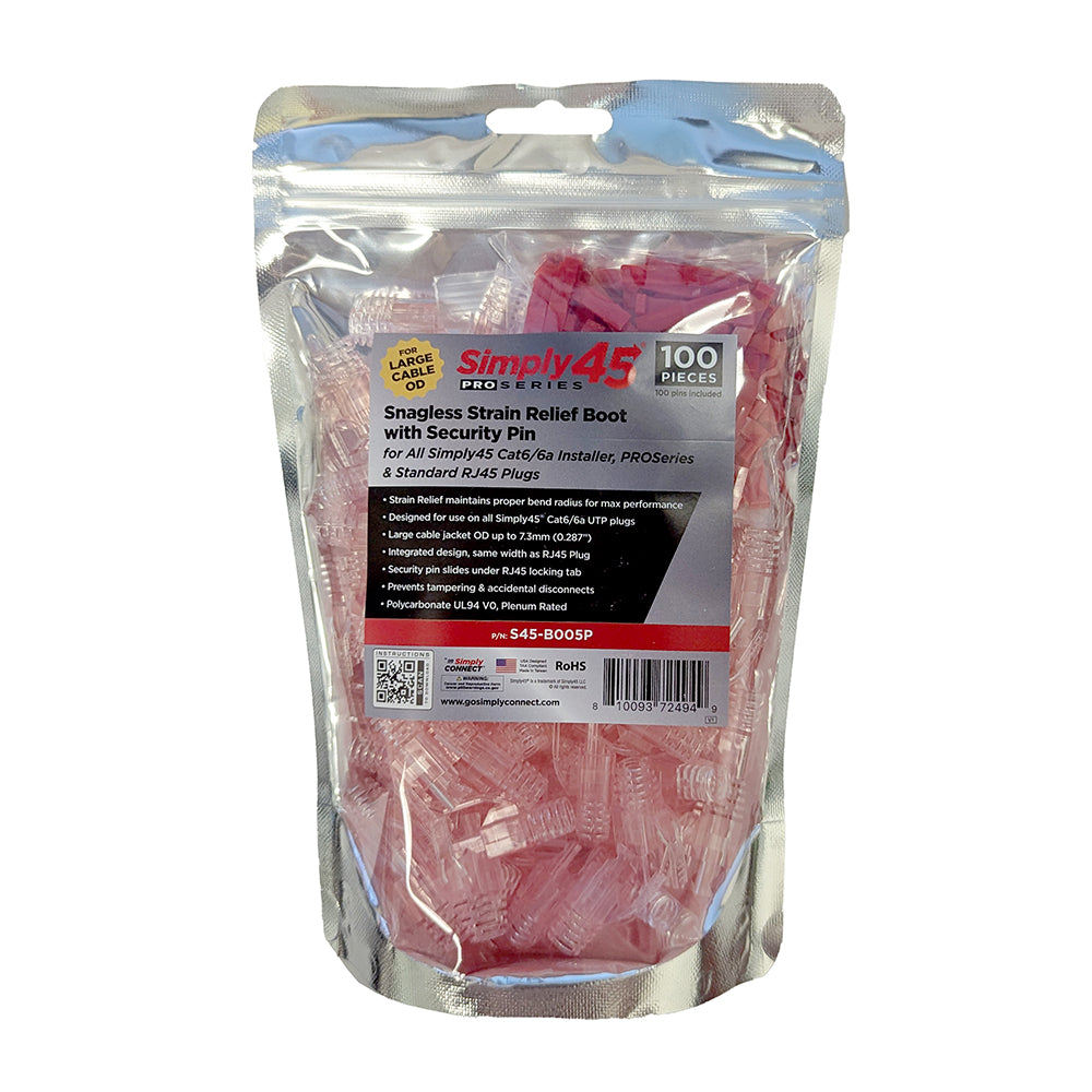 Simply45 PROSeries 7.3mm Strain Relief with Locking Pin for all Simpy45® UTP Cat6/Cat6A RJ45, Red Tint - 100pcs/bag