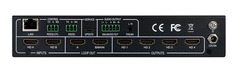 • Two HDMI loop-outs to cascade into other units for larger video walls or to monitor sources locally