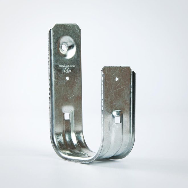 Garvin's JHK-64 has a wide base and smooth, rounded corners to prevent snags while cables are being run. It is recommended that J-hooks be placed no more than 5 feet apart, and they can be attached to a wide variety of surfaces such as beams, studs, and ceilings. The pre-drilled screw hole makes attachment to structures quick and easy. Depending on the quantity and weight of your cables, you may need to space cable supports more frequently as excessive sagging between hooks is not optimal. Cable ties or other wire management types may be used to secure wires into place by running them through the small pre-punched holes on the hook.