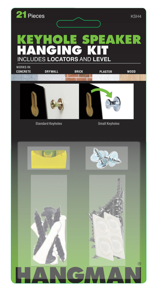 Take the frustration out of hanging speakers with keyholes with the Keyhole Speaker Hanging Kit. Provided keyhole screws work with single or double keyholes, standard or small. Included locators mark the exact insertion point so you don't need to guess on a blind installation. The handy level ensures speakers are level and secure. Double-headed Bear Claw Keyhole Hangers install with a handheld screwdriver into drywall, wood, and plaster, and into brick or concrete with a 1/8" pilot hole. Will hold 30 lbs in drywall and 100 lbs. in stud. Included anchors provide added strength for drywall.