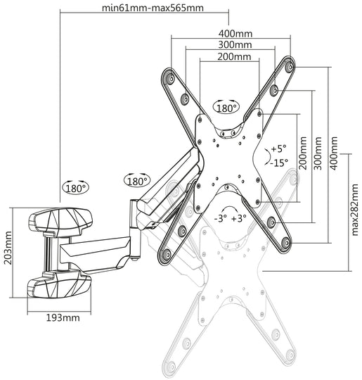 - Extends display 61 mm (2.4 in.) to 565 mm (22.24 in.) from wall