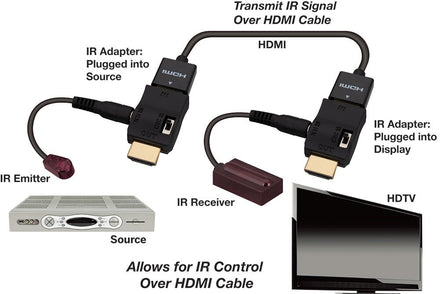 - Connect the HDMI IR Adapters to each end of the HDMI cable, and then plug adapters into the source and display