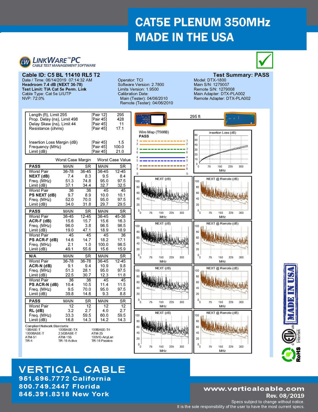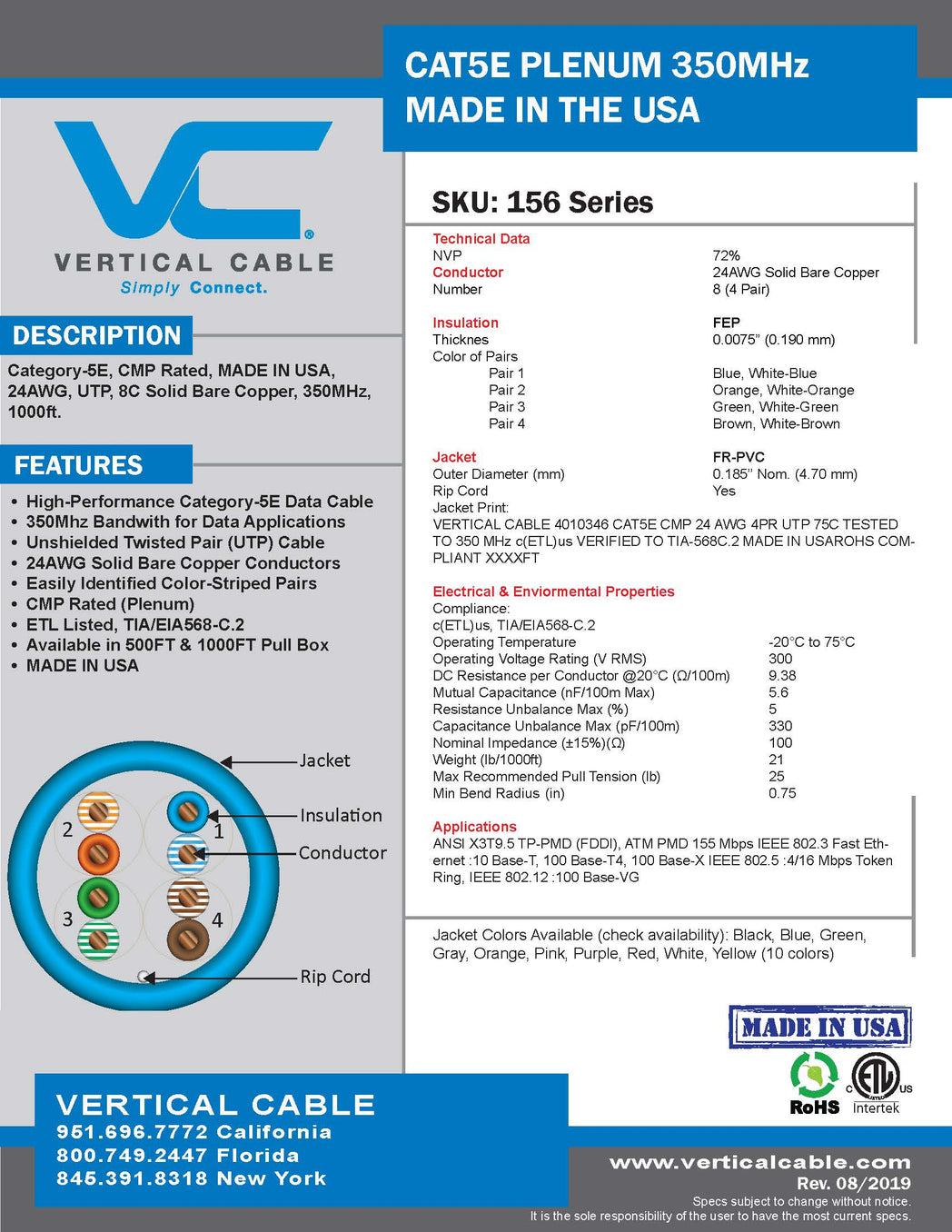 - Marking on Jacket: CAT5E CMP 24AWG FTP c(ETL) US FT6 350MHz ETL VERIFIED CAT5E TO TIA-568B.2 RoHS XXXFT (SEQUENTIAL FOOT MARKERS ON JACKET)