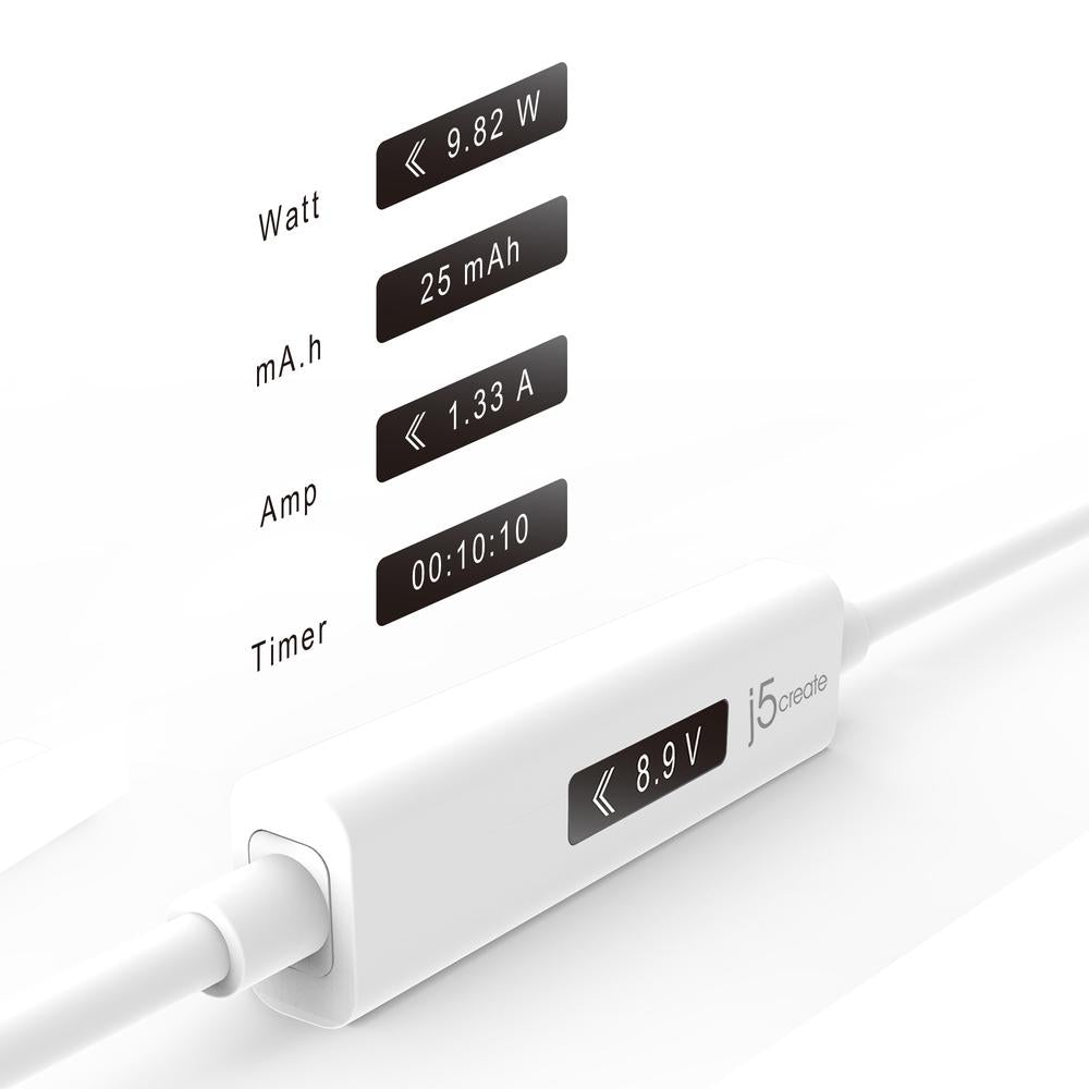 j5create JUCP13 USB™ Type-A 2.0 to USB-C™ Cable with OLED Dynamic Power Meter, 4ft