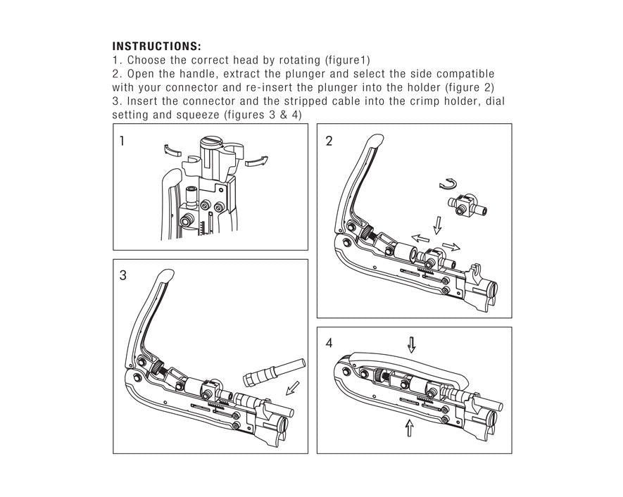 - Dual-head and adjustment dial to accommodate various connectors such as RG59, RG6, RG7, and RG11 quickly and easily (BNC connectors must be at least 1.5” in length)