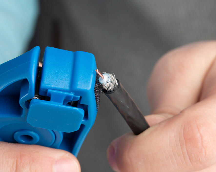 - Stripping action removes 1/4" of jacket and 5/16" of shield and dielectric, which exposes the center conductor