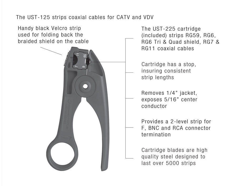 - Included blade cartridge (UST-225) provides a 2-level strip for F, BNC, and RCA connector termination