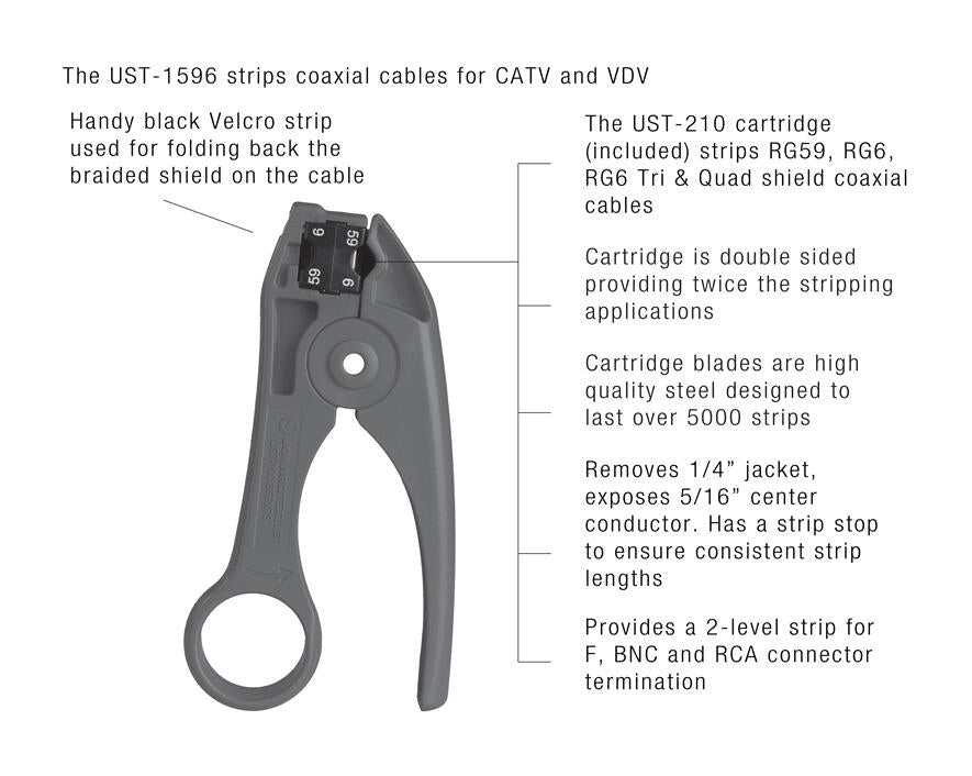 - Included blade cartridge (UST-210) provides a 2-level strip for F, BNC, and RCA connector termination
