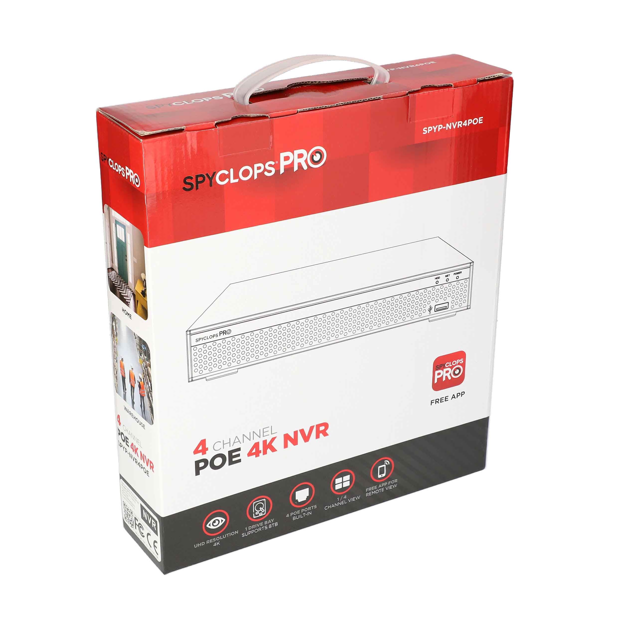 Record video surveillance in up to 8MP 4K for each channel with the Spyclops PRO 4-channel NVR. This Network Video Recorder supports H.265 and H.265+ for maximum video storage efficiency. HDD drive bay supports up to 8TB HDD. The NVR has VGA and HDMI outputs and uses 4-channel Power over Ethernet (PoE) LAN port connections. The Spyclops PRO free remote viewing app is available for Android and iOS devices, in addition to accessing video surveillance securely through a web. Compatible with Spyclops cameras.
