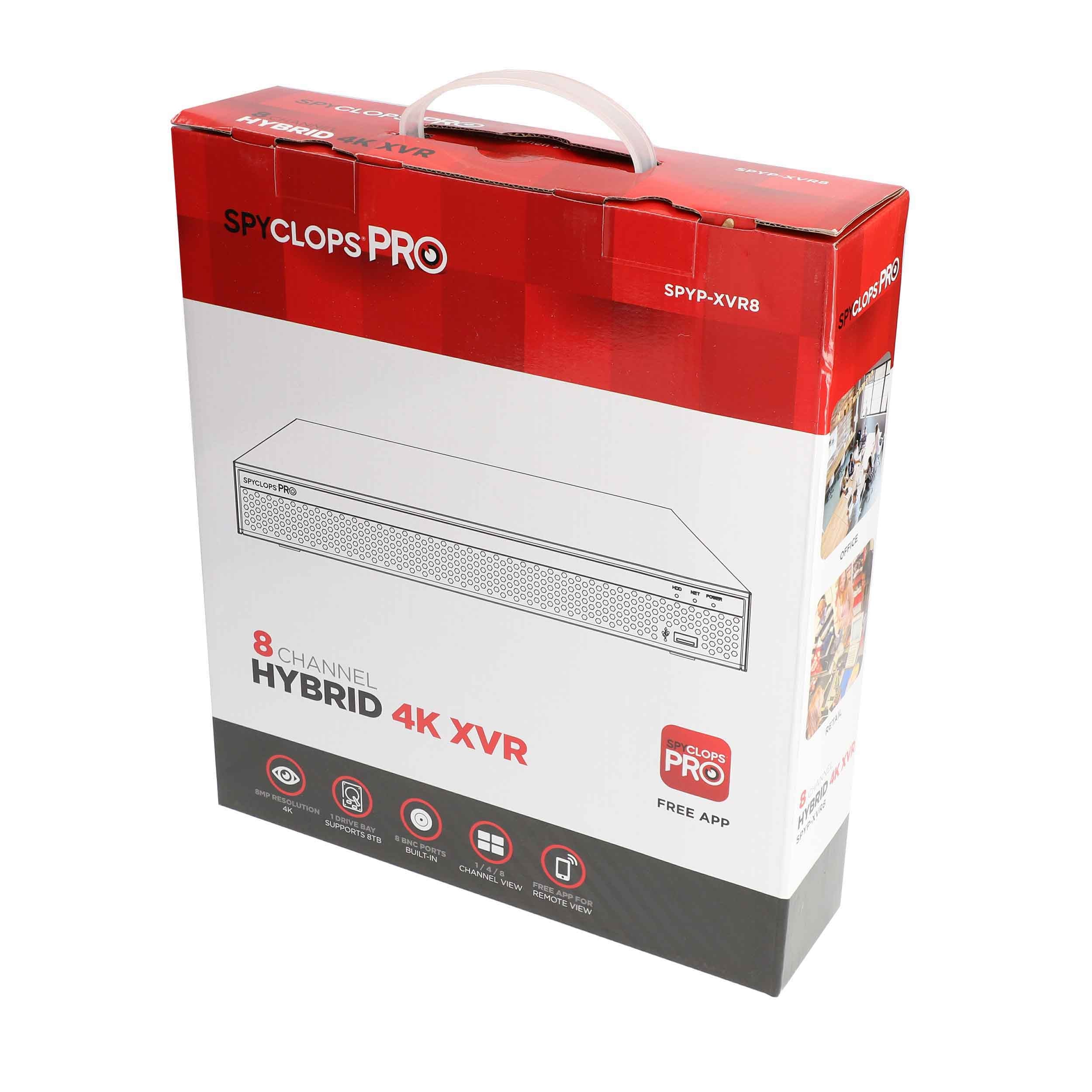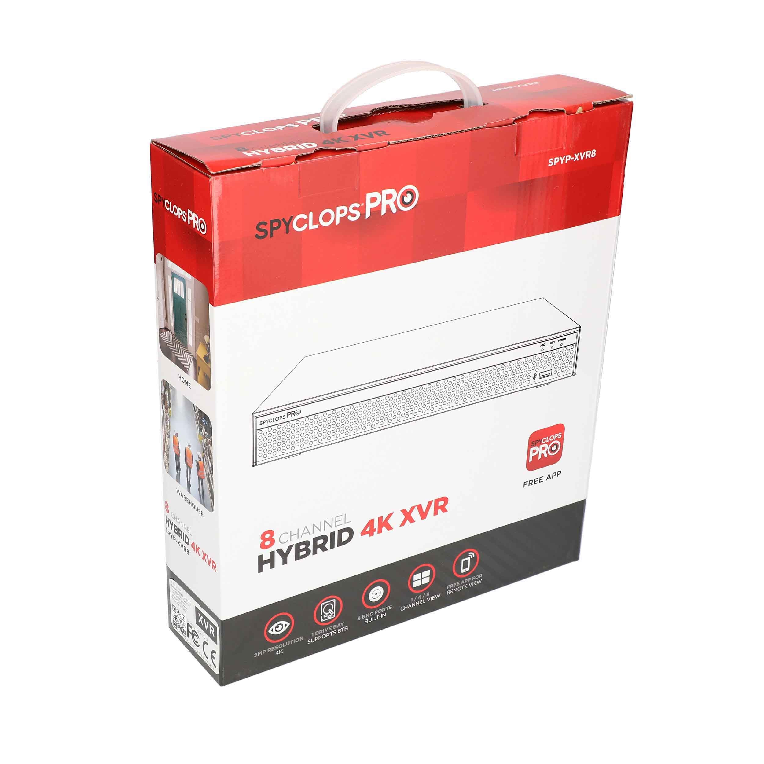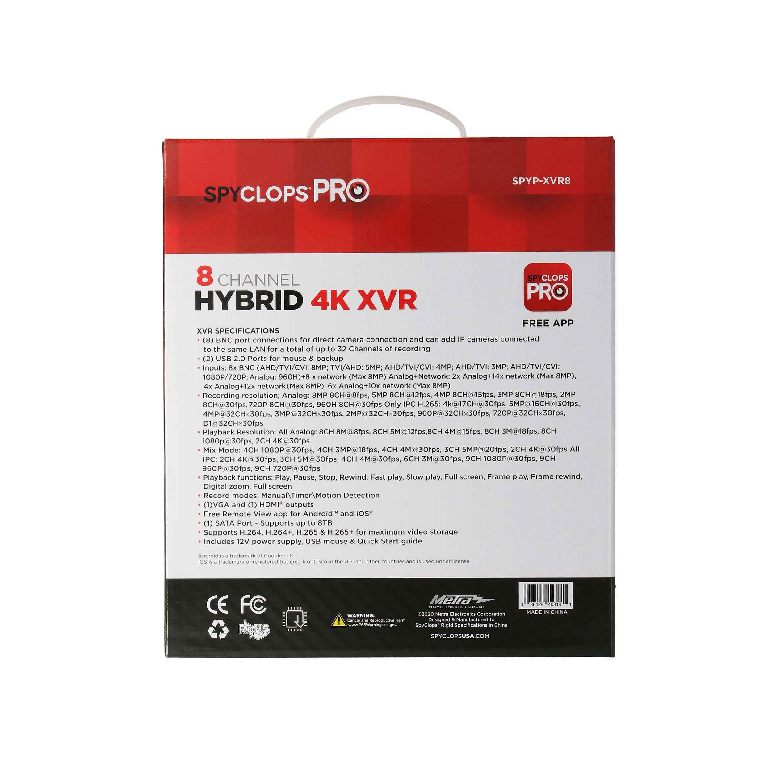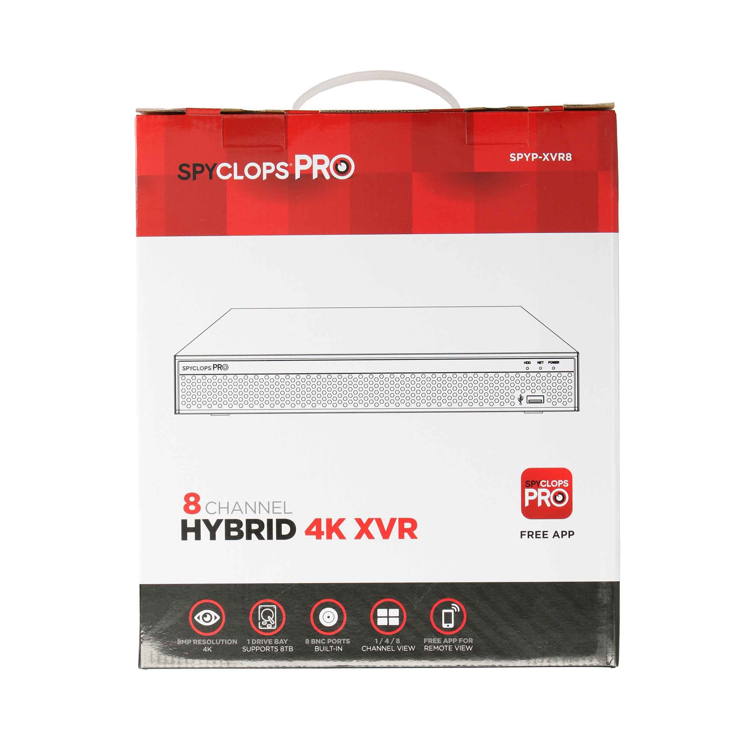 Record video surveillance in up to 8MP 4K for each channel with the Spyclops PRO 8-channel XVR. This 4K capable Video Recorder supports H.265 and H.265+ for maximum video storage efficiency. HDD drive bay supports up to 8TB HDD. The NVR has VGA and HDMI outputs and uses 8-channel BNC connections.