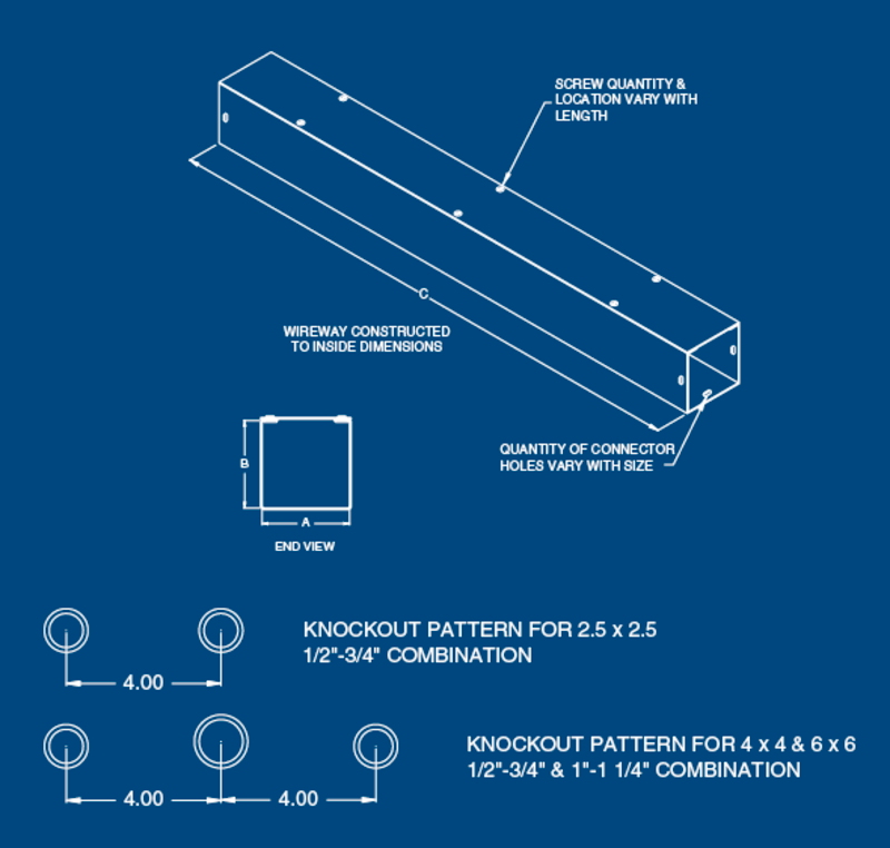 Fabricated in accordance with UL specifications from code gauge steel. Cover has keyhole slots to permit easy removal without removing screws. Single sheet steel for body. Wireway can be furnished with or without knockouts in 2 ½ x 2 ½, 4 x 4, and 6 x 6 only. 8x8, 10x10, and 12x12 furnished only without knockouts.
