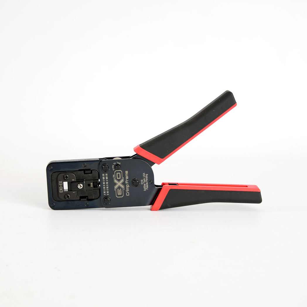 The Platinum Tools 100061C EXO™ Crimp Frame with EXO-EX Die™ features an interchangeable and reversible die set and push lock button for easy storage. Part of the ezEX-RJ45 termination system, the 100061C helps maneuver the challenges of ever-increasing cable and insulation diameters which may vary by manufacturer. It's designed for use with ezEX™44 and 48 connectors. The unique design of these connectors accommodates larger cable diameters, as well as makes sequence verification easier through the one-piece pass-through body. This crimp frame allows quick, secure termination and flush trim with a single cycle. The reversible EXO die enables ambidextrous operation with ergonomic TPR handles for comfort.