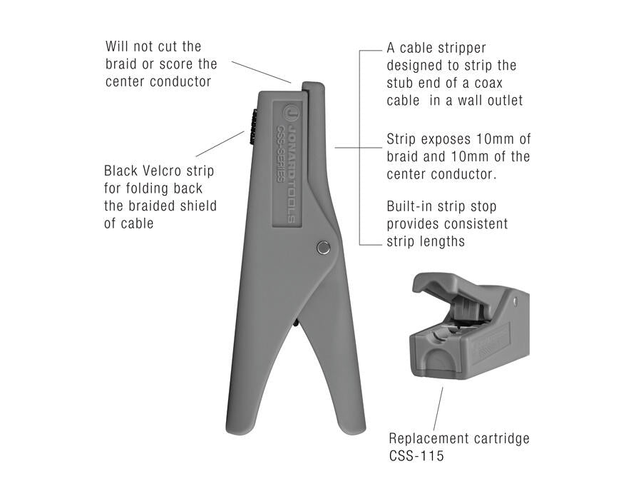 The CSS-5097 is a coaxial cable stripper specifically designed to strip the stub end of a coax cable in a wall outlet, exposing 9 mm of braid and 7 mm of the center conductor, which eliminates the need to run new cable.