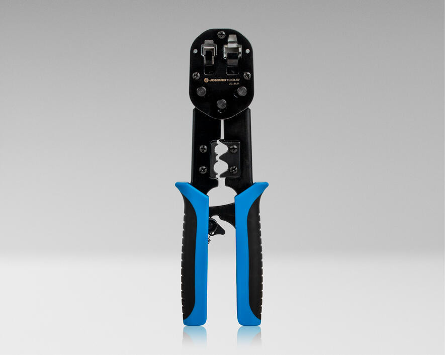 - Vertical crimp action crimps RJ11, RJ12, and RJ45 pass-through connectors perfectly every time