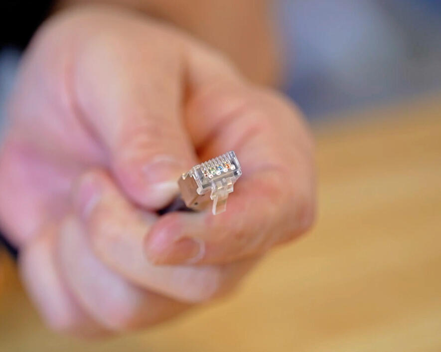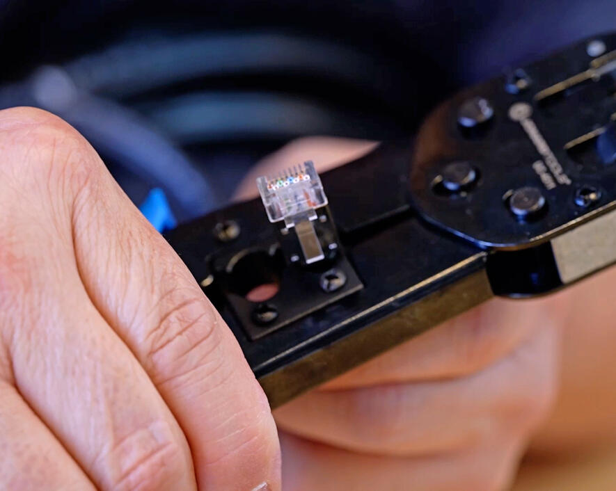 - Cleanly trims the wires flush to the end face of pass-through RJ11/12 and CAT6A RJ45 connectors
