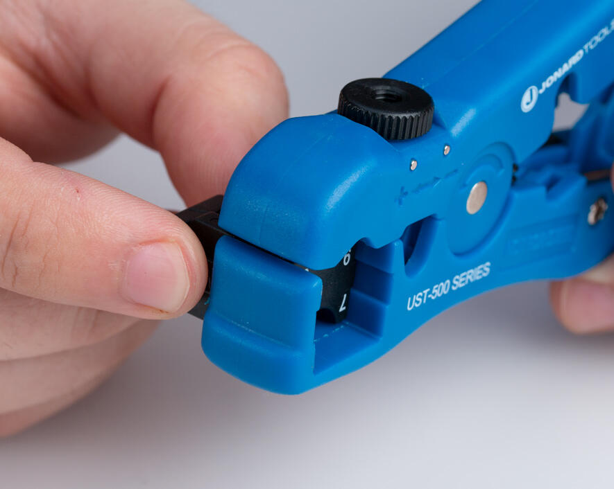 - Included blade cartridge (UST-205) provides a 2-level strip on RG59, RG6, RG7, and RG11 COAX Cables for F, BNC, and RCA connector termination