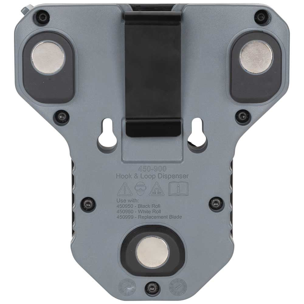 This time-saving Hook and Loop Tape Dispenser takes the hassle out of cutting hook and loop tape to make custom-length hook and loop strips. Clip it to a belt, mount it to a metal surface using the powerful Rare-Earth magnets, or use the keyholes for screw mounting. Tape can be cut to any length with easy, one-handed cutting action using the integrated cutter. Strong, yet flexible hook and loop tape securely holds and manages wire and cable bundles of any size.
