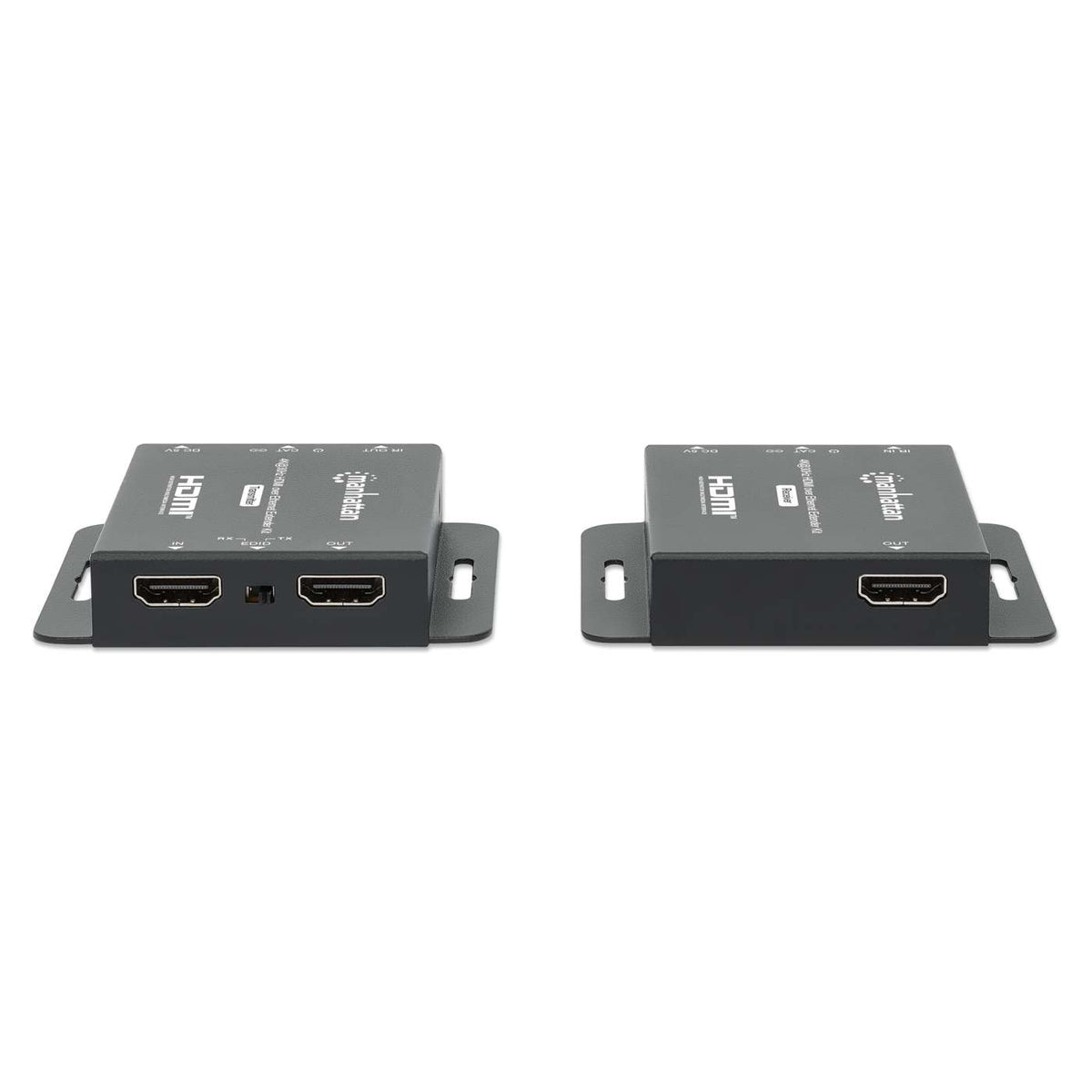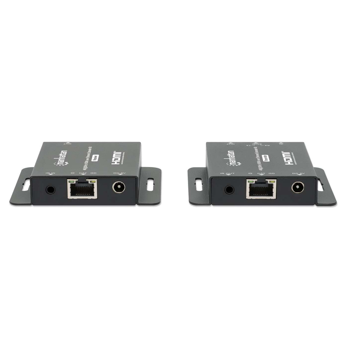 The Manhattan 4K HDMI over Ethernet Extender Kit lets you transmit an audio/video signal in 4K@30Hz (3840 × 2160) up to 40 m (164 ft.) or 1080p@60Hz up to 70 m (230 ft.) via a single RJ45 Cat6 Ethernet cable. The Kit provides reliable video and multichannel audio transmission for your streaming device, gaming console (PS4, PS4 Pro, PS5, Xbox Series X/S, Switch etc.), Blu-ray player, satellite receiver, PC, laptop, MacBook® or other HDMI device over longer distances than standard HDMI cables alone can achieve. The transmitter and receiver have additional 3.5 mm jacks for Infrared (IR) inputs that let you control the source or display at either end of the setup.