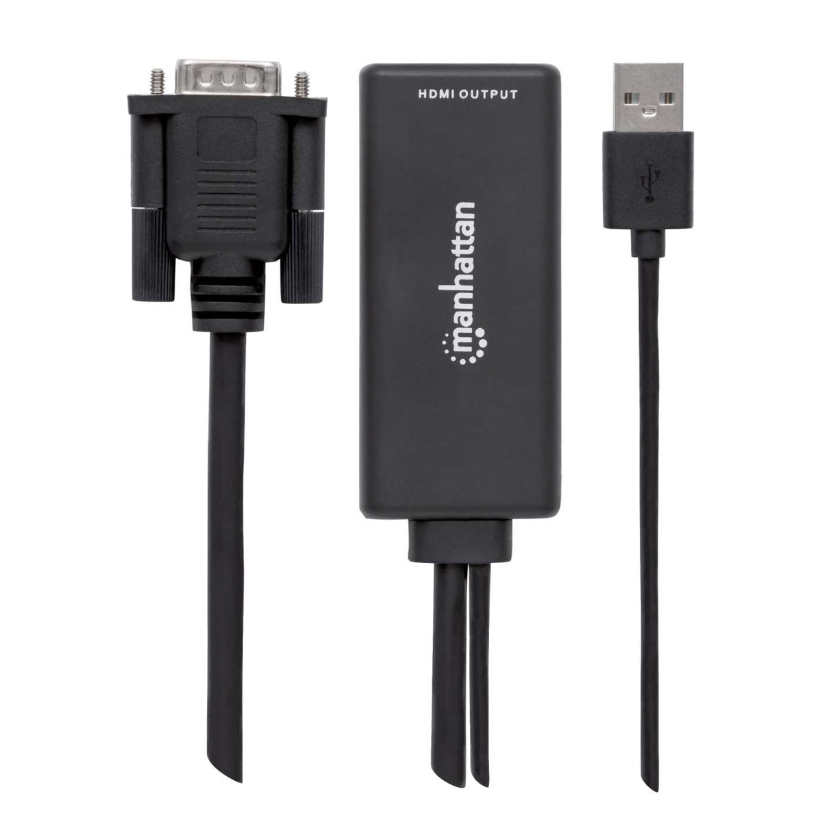 The Manhattan VGA and USB to HDMI Converter translates analog PC audio/video signals to HDMI format for compatible projectors, flat-panel HD displays, televisions and more. Advanced built-in circuitry lets you easily enjoy PC-based media on high-definition displays or TVs and maintains simultaneous A/V reception at the source PC. High bandwidth capability supports video resolutions up to 1920 x 1080 and 1080p@60Hz, serving beautifully for training, retail and trade-show purposes. Quick Plug and Play installation and Windows and Mac compatibility means the Manhattan VGA and USB to HDMI Converter makes it easy to deliver digital content stored on any desktop and notebook computers.