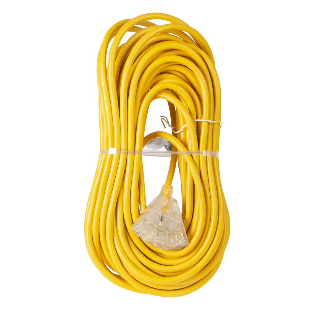 Extension Cord 100ft SJTW Yellow 12/3 Lighted End Triple Tap