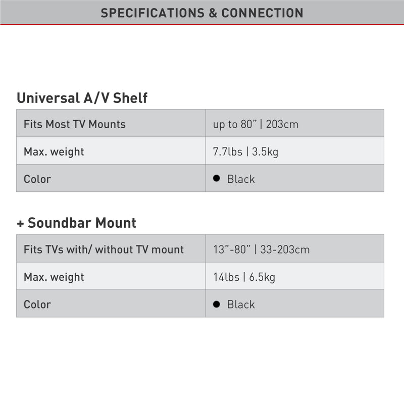 • Safety tested with a load of 57lbs/ 26kg for the soundbar mount and 43lbs/ 19.5kg for the shelf.