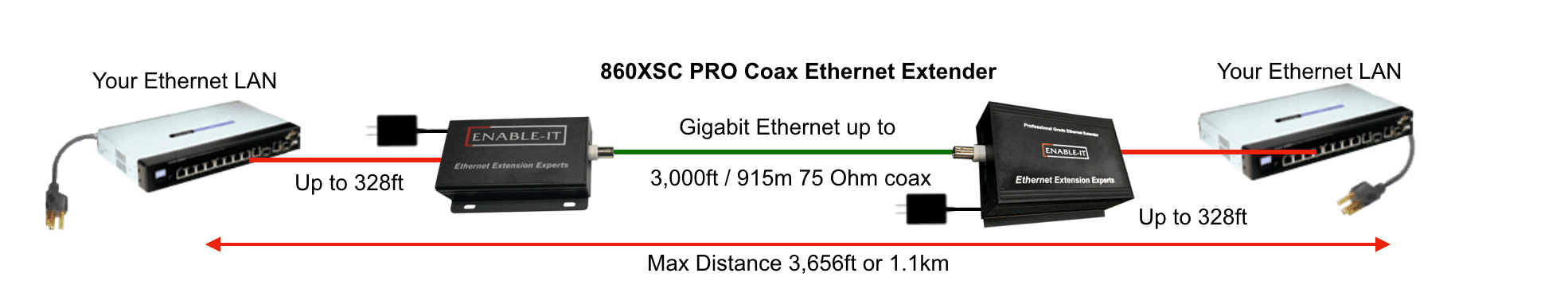 The Enable-IT 860XSC PRO Black Box Gigabit Coax Ethernet Extender is a Gigabit wire speed throughput Coax Ethernet Extender.